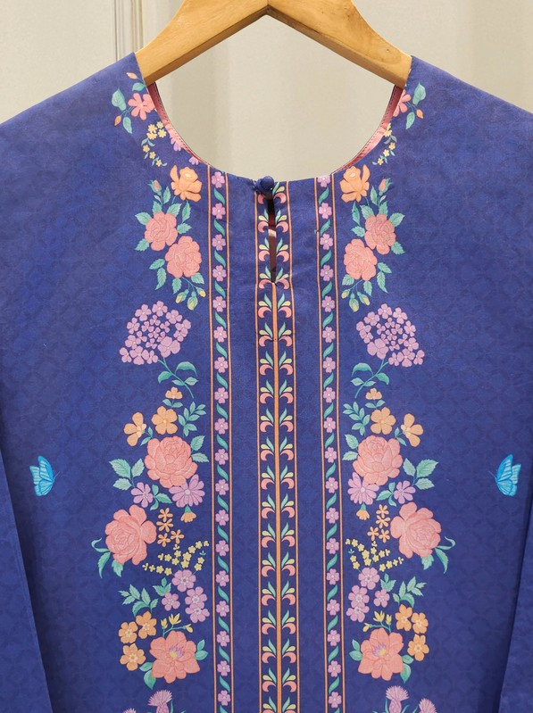 Elevate your summer wardrobe with this beautifully crafted navy blue lawn shirt, featuring intricate Chikan Kari work on the sleeves and daman. Designed for timeless elegance, this piece blends breathable lawn fabric with traditional craftsmanship, perfect for festive occasions or casual sophistication. Pair it with pants for a complete look.