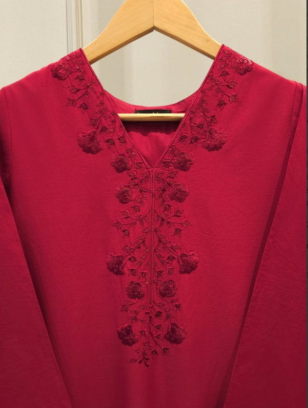 Elevate your summer wardrobe with this beautifully crafted red cambric shirt, featuring intricate Chikan Kari work on the sleeves and daman. Designed for timeless elegance, this piece blends breathable lawn fabric with traditional craftsmanship, perfect for festive occasions or casual sophistication. Pair it with pants for a complete look.