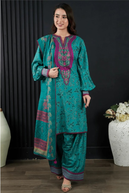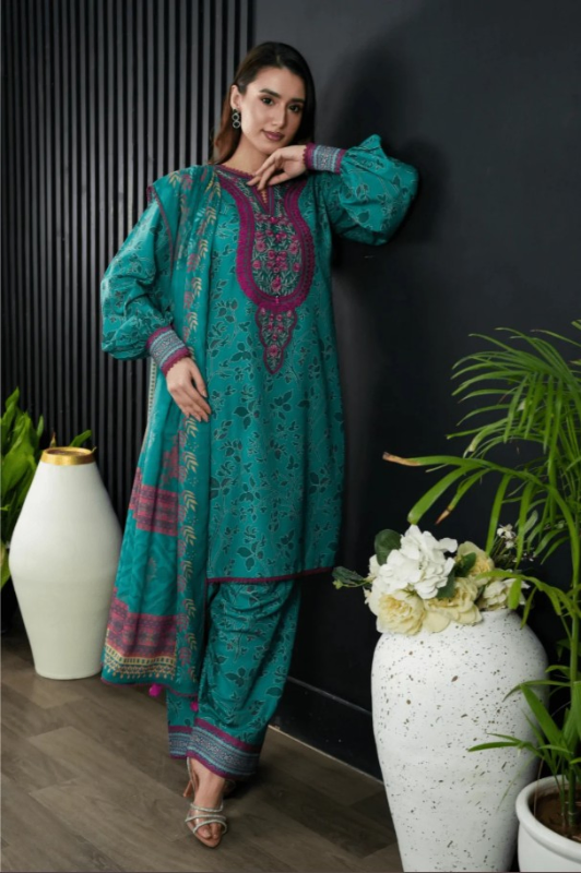 Winter collection Elevate your wardrobe with this luxurious 3-piece suit from Ayesha.B. Crafted on premium Slub cambric fabric, this design features beautiful digital prints paired with intricate embroidery work for a perfect blend of tradition and trend.