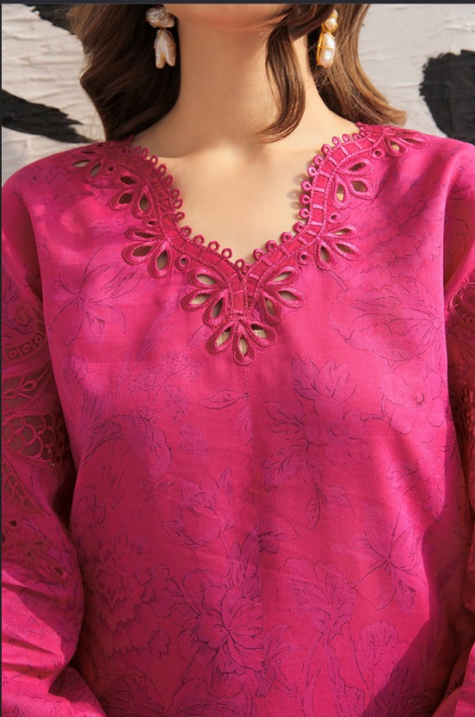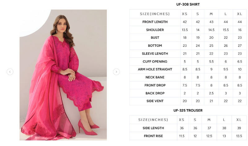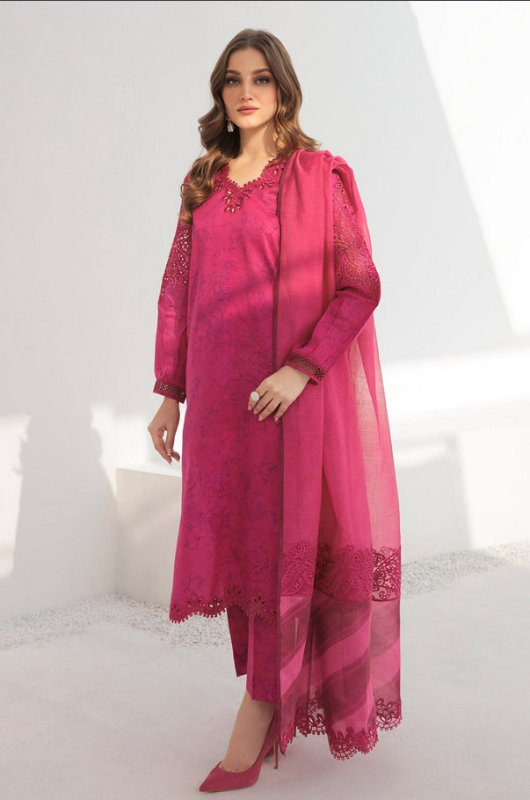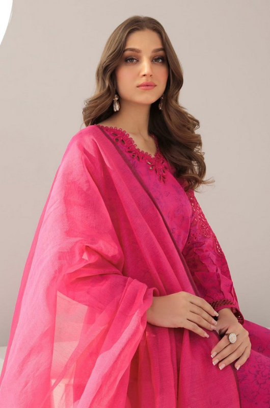 This 3-piece ensemble includes a printed lawn shirt, printed lawn trousers, an embroidered organza neckline patch, embroidered organza sleeves patch, embroidered slits and daman patch, along with a digital-printed cotton patti dupatta and an organza dupatta with embroidered pallu patch. Size: Small(37), Medium(40), Large(44)