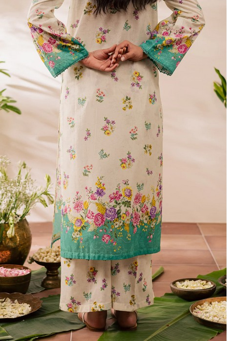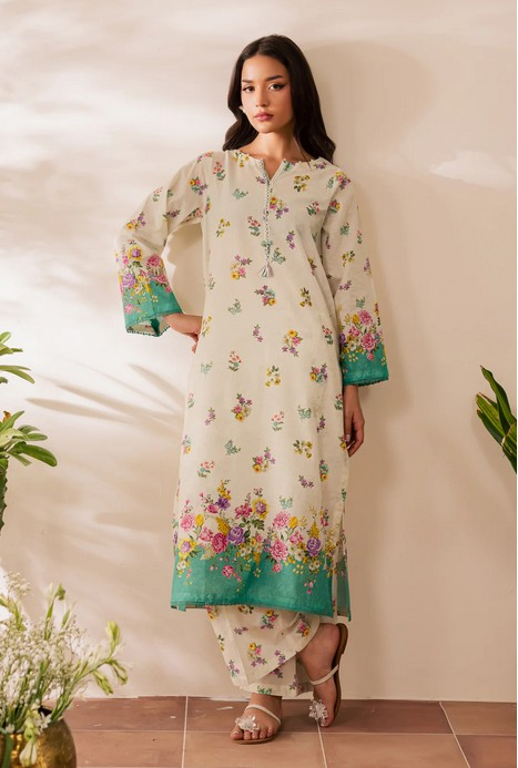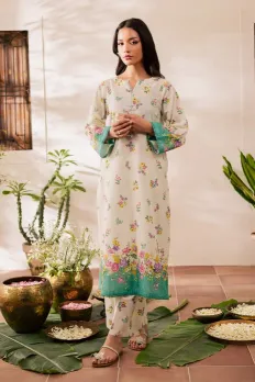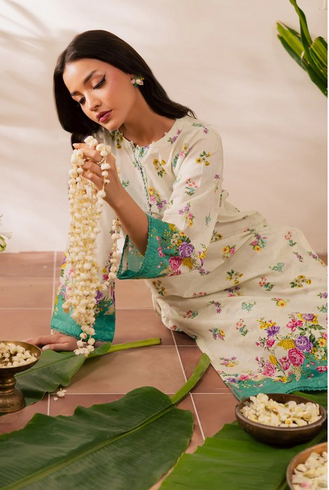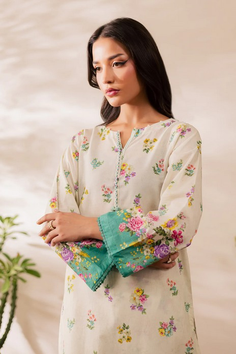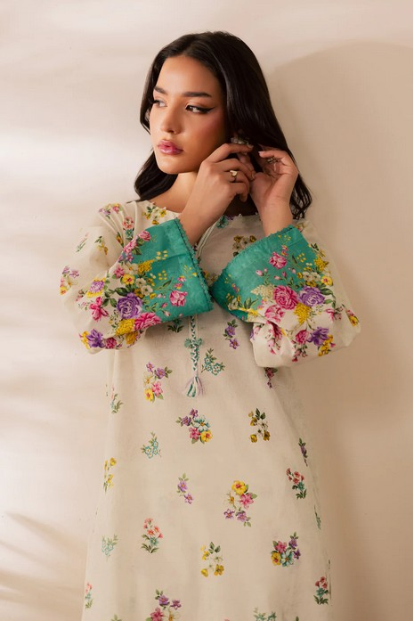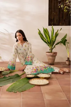 A beautifully printed long off white lawn shirt featuring a statement neckline adorned with a braid and tassel collage, adding a playful yet elegant detail. The sleeves and shirt hem are enhanced with delicate lace, lending a graceful and polished finish to the design.