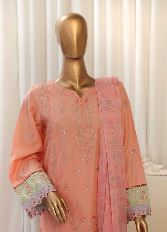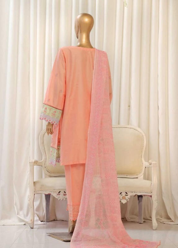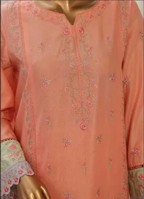 3 Piece Peach Color Embroidered Cotton Stitched Suit with Chiffon Dupatta and Embroidered Trouser