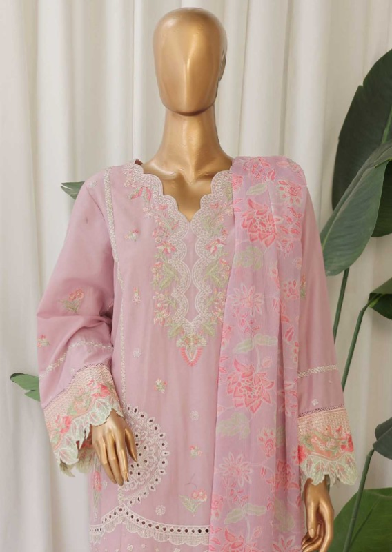 3 Piece Dusty Pink Color Embroidered Cotton Stitched Suit with Chiffon Dupatta and Embroidered Trouser