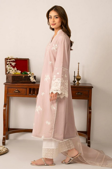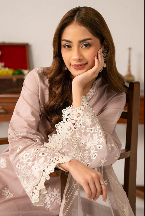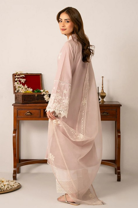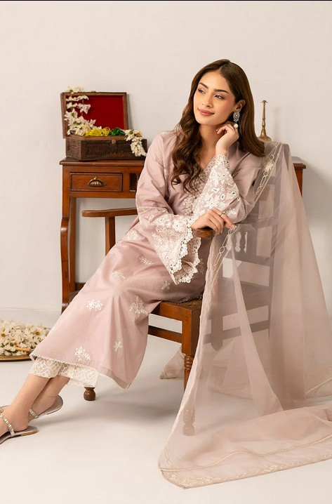 This elegant 2-piece set includes a straight shirt and a poly organza dupatta. The front of the shirt is embroidered with lace on the hem and side slits, while the back is dyed for a sleek finish. The flared sleeves feature delicate lace embroidery, and the half-standing band neckline is adorned with lace and tassels. Perfect for adding a touch of sophistication to any outfit.