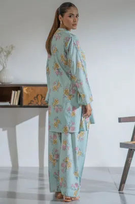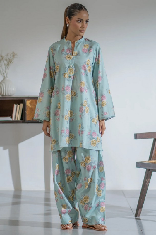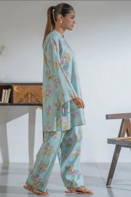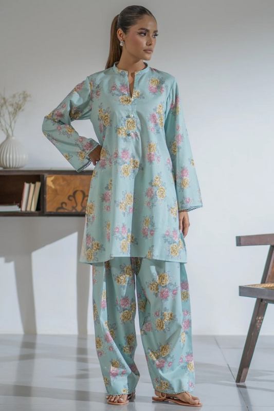 This kurta and shalwar comes in a refreshing sky blue base, adorned with vibrant yellow and pink floral prints. The fabric offers a soft, breathable texture perfect for summer wear.