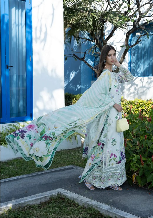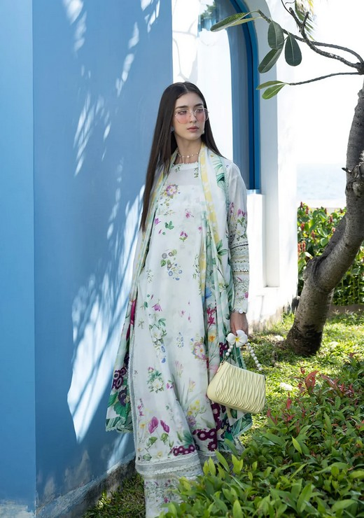 MOON FLOWER includes a printed lawn shirt with matching sleeves and back, a light voile dupatta, and a cambric trouser. The colors and patterns are easy to match, helping you look neat without extra effort.