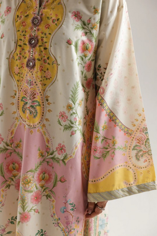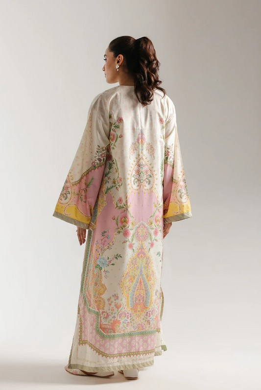 This sophisticated embroidered kaftan epitomizes effortless elegance with its floor-length silhouette and thoughtfully designed construction. The ivory foundation is enriched with delicate botanical prints in pastel pink, sunny yellow, and mint green, complemented by intricate borders that frame the design. A gracefully scalloped neckline and generously proportioned wide sleeves enhance the relaxed yet refined aesthetic, while strategically placed high side slits ensure comfortable movement. The loose-fit kaftan style offers versatility for both casual gatherings and formal occasions.