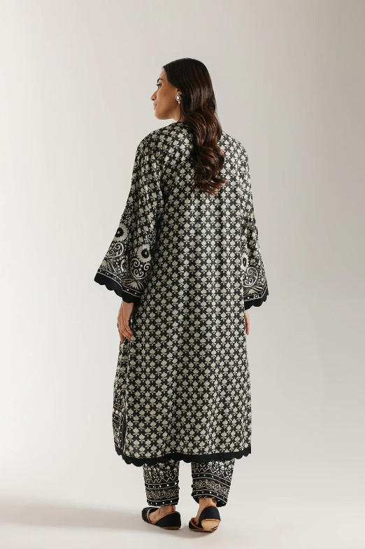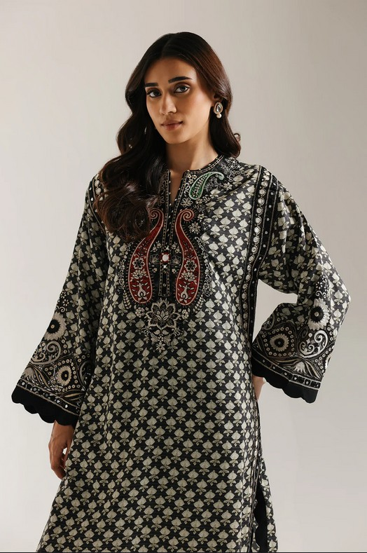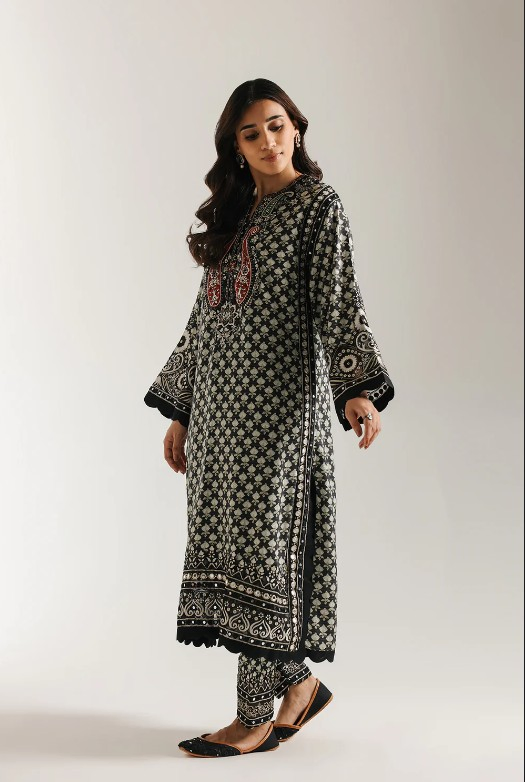 Step into dramatic elegance with this captivating black embroidered suit. The long, straight-cut kurta features an intricate all-over white geometric print that creates a dense, mesmerizing texture. The neckline is the centerpiece, adorned with rich embroidery in contrasting shades of red, green, and cream that form striking traditional motifs. The wide sleeves are finished with a beautifully scalloped cuff, mirroring the detailed hemline. The ensemble is perfectly completed by tailored shalwar that carry a coordinating, intricate print and is finished with matching embroidered hem, creating a stunning and cohesive look.