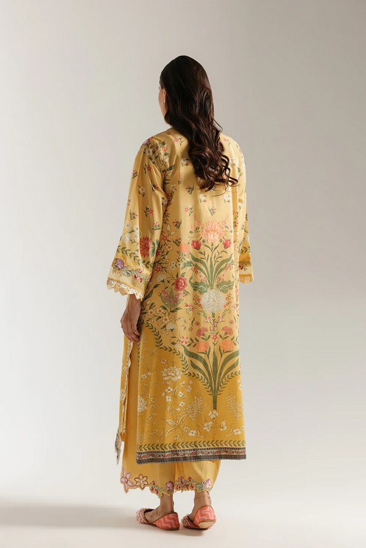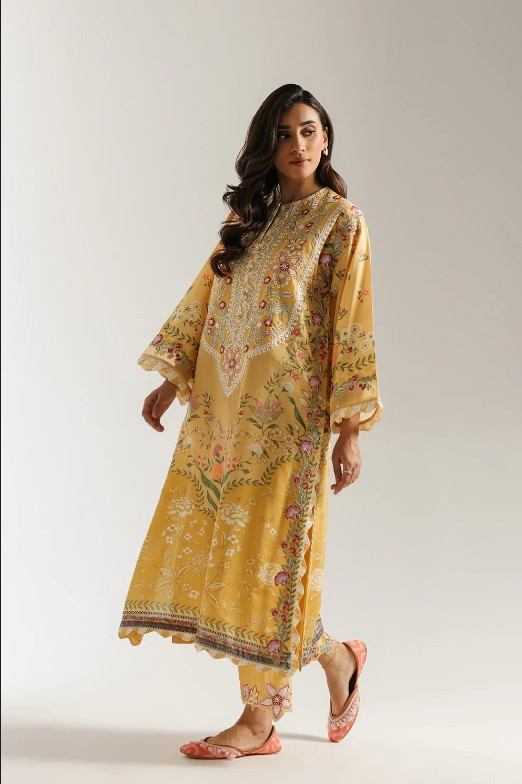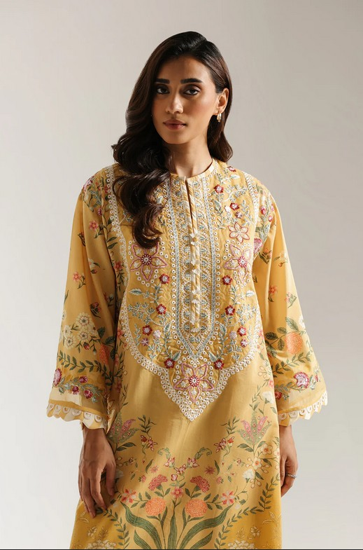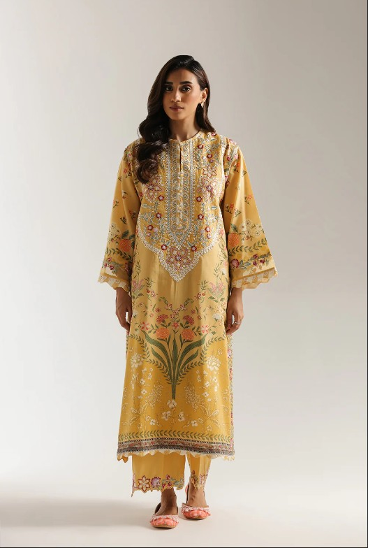 This vibrant suit is rendered in a warm, sunshine yellow, and is adorned with a beautiful and intricate embroidery. The long-line shirt features a densely embroidered front panel with multi-colored floral and paisley motifs in shades of pink, blue, and green, centered around a simple neckline. The flared sleeves and embroidered scalloped hem on the trousers complete this elegant and detailed ensemble.
