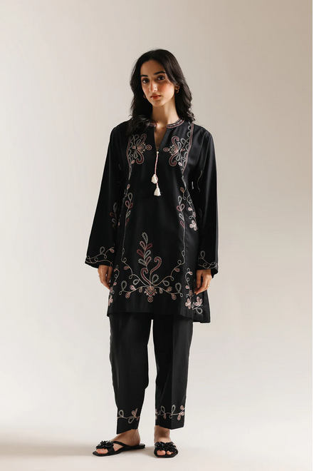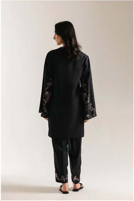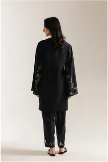 Embrace timeless elegance with this stunning black embroidered suit. The kurta showcases intricate floral embroidery in soft pinks and white cream, creating beautiful abstract patterns across the front and sleeves. Rich detailing adorns the neckline and wide sleeves, adding depth and sophistication to the design. Paired with perfectly tailored embroidered trouser, this luxurious ensemble delivers a striking, refined look that captures the essence of traditional craftsmanship.