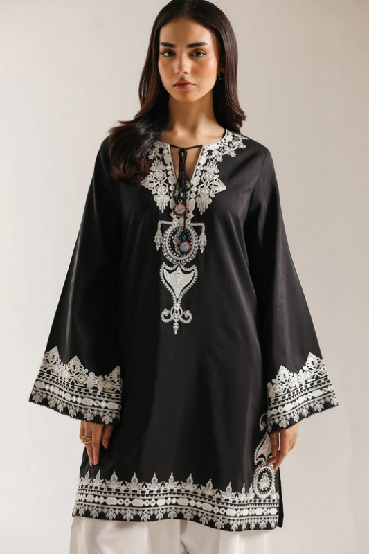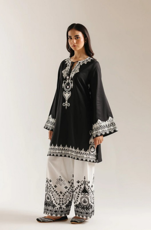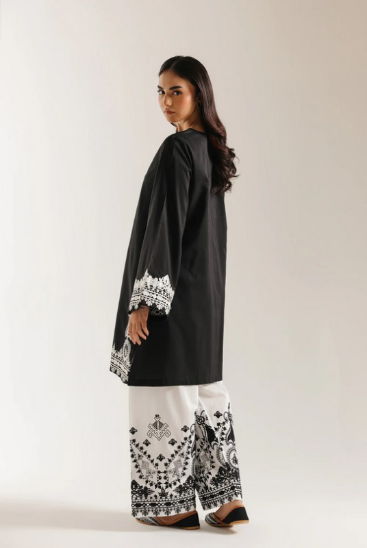 Step into a world of refined contrast with this striking two-piece embroidered suit, where bold monochromatic tones meet traditional artisanal flair. The ensemble features a deep black, long-sleeved shirt designed with a sophisticated split neckline, secured by a delicate tie-up detail and accented with vibrant beaded tassels. Exquisite white embroidery anchors the look, framing the neckline with regal motifs and adorning the wide sleeve cuffs and hemline with intricate geometric and floral borders. This elegant shirt is perfectly balanced by voluminous white wide-leg shalwar, which showcase a dramatic black folk-inspired print reaching from the mid-calf to the hem. Whether attending a formal dinner or a festive gathering, this suit offers a commanding silhouette that is both timeless and modern.