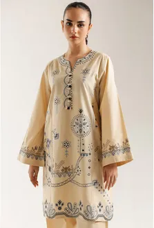 Embrace sophisticated artistry with this refined embroidered suit. Crafted in a soothing beige hue, the straight-cut kurta is beautifully embellished with intricate geometric and floral embroidery in contrasting grey and blue thread, which gracefully flows down the front and adorns the wide sleeves. The neckline features a classic split with subtle accent detailing. The ensemble is perfectly completed with matching loose fit shalwar that feature complementary embroidery motifs near the hem, creating an elegant and harmonious traditional look.