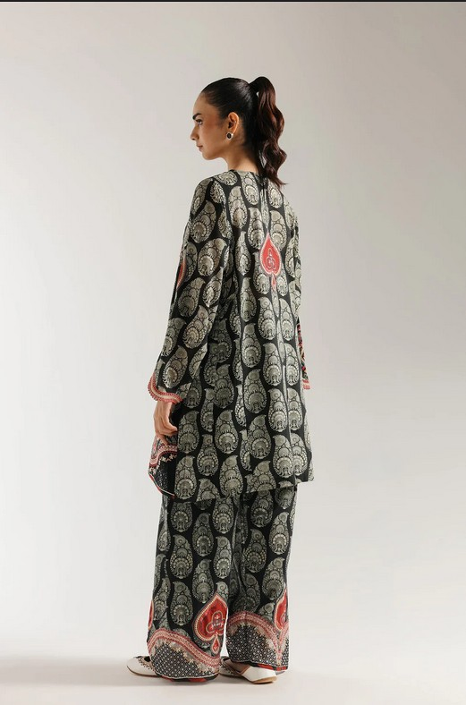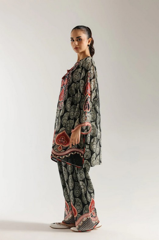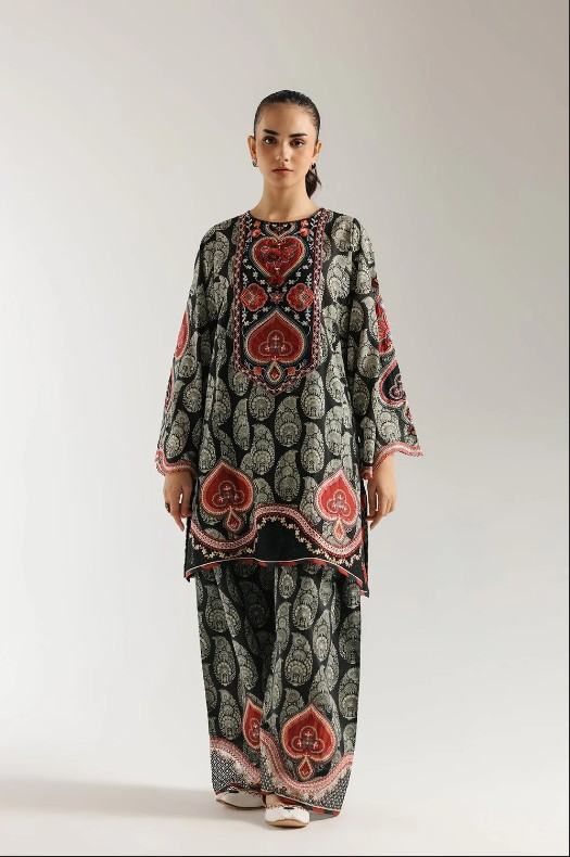 Make a bold artistic statement with this captivating black printed ensemble, a harmonious blend of traditional patterns and contemporary flair. The rich black tunic features a classic round neckline, beautifully adorned with intricate red and black embroidery that creates a striking central design. The tunic is an expressive canvas, featuring an all-over print of unique, stylized teardrop motifs in red and white against the black, lending a distinct cultural appeal. The full-length sleeves are finished with complementary patterned borders. Completing this powerful look is a perfectly matching shalwar, continuing the striking print for a cohesive and sophisticated silhouette. Perfect for festive celebrations, cultural events, or any occasion where you desire to showcase unique style and undeniable confidence.