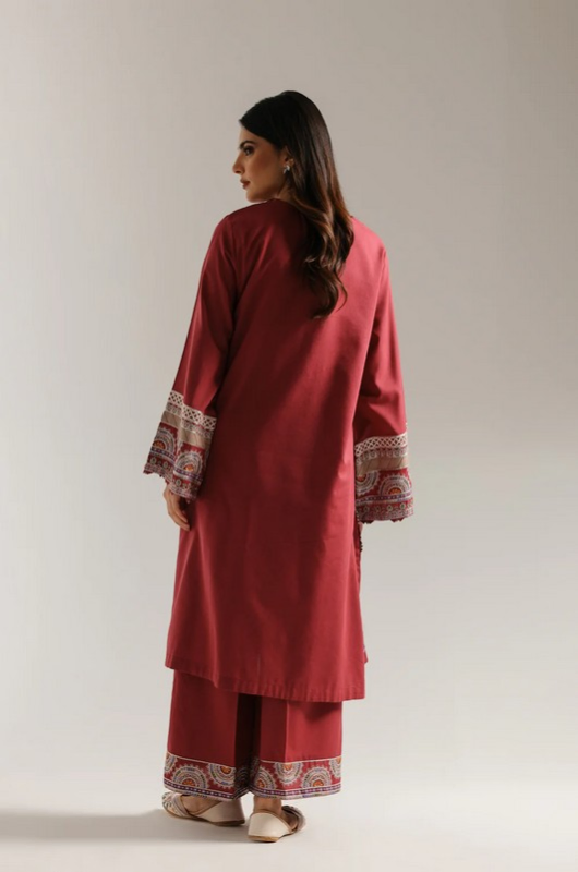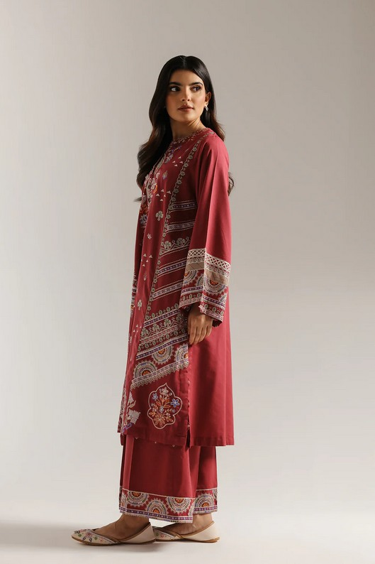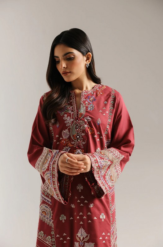 This exquisite suit is a beautiful showcase of intricate embroidery and rich color. The long tunic in striking hot pink hue serves as a perfect backdrop for the elaborate, multi-colored patterns. The embroidery features a captivating mix of floral and paisley motifs that flow from the neckline down the front and across the wide, flared sleeves. The tunic is paired with matching trousers that feature a complementary embroidered border, creating a cohesive and stunning ensemble. This outfit is a true statement piece, ideal for a festive occasion or an elegant gathering.