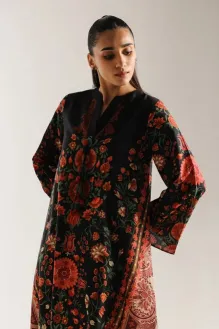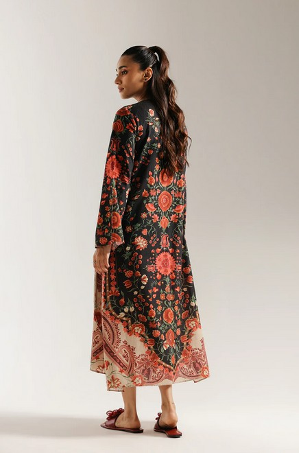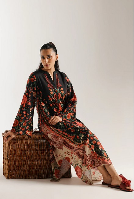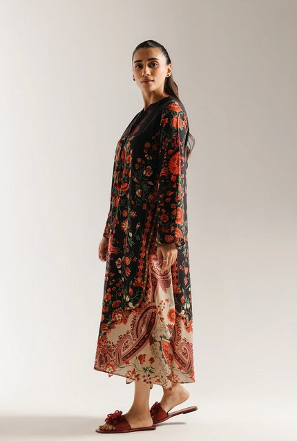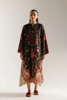 dress. This elegant black maxi dress features a vibrant, all-over floral pattern in rich shades of red and green that beautifully contrast with the dark base. A striking, intricate paisley border adorns the hem, adding a unique touch. Its flowing silhouette and relaxed fit create a luxurious and comfortable look perfect for any special occasion.