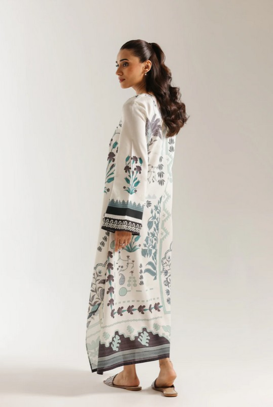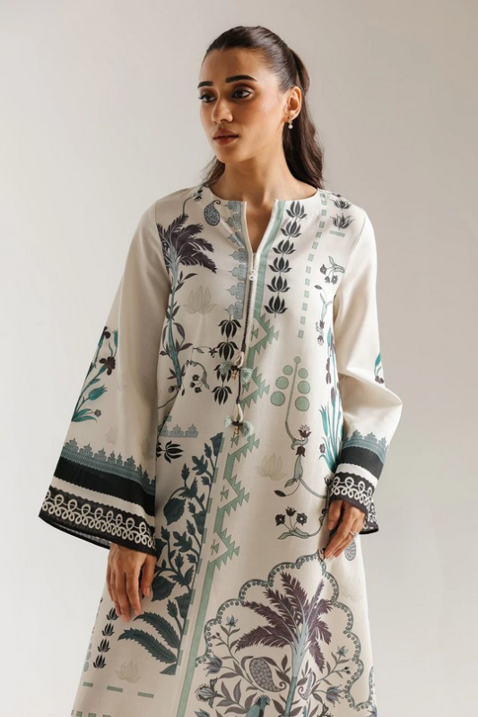 This elegant A-line dress combines timeless sophistication with contemporary ease. The handkerchief hemline creates an effortlessly flowing silhouette, while the split crew neckline features refined tassel detailing along the front placket. Generously cut sleeves with bordered cuffs frame the shoulders beautifully, complementing the coordinated hem design. The composition merges botanical artistry—delicate florals and bird illustrations—with geometric borders in a refined palette of charcoal black, sage green, and muted plum against a cream base. Perfect for those seeking understated elegance with artistic depth.