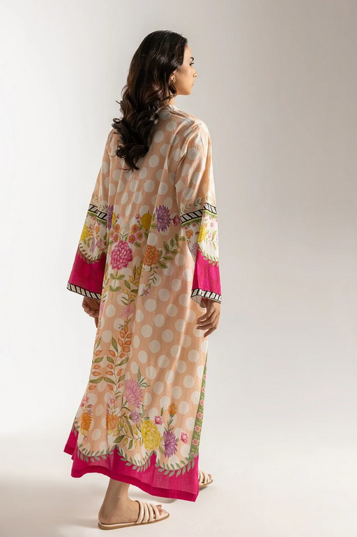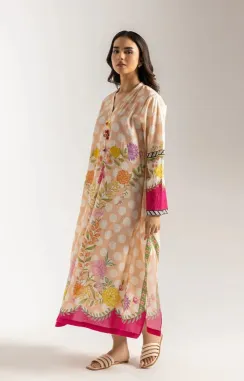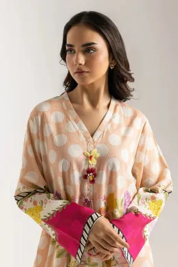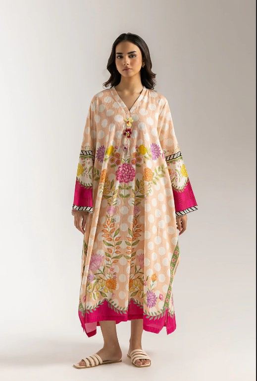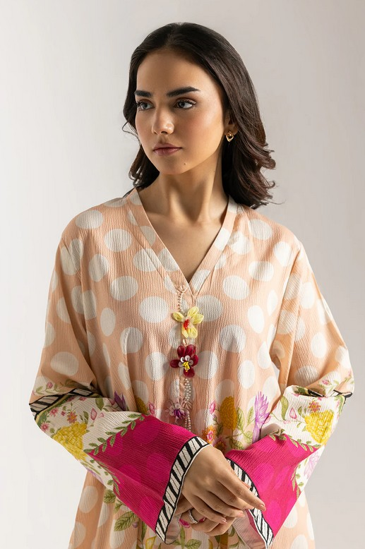 A whimsical masterpiece of color and print, this long tunic is a true work of art. The light, peachy-pink fabric is adorned with a playful polka dot pattern, which serves as the backdrop for a bold, artistic floral design in vibrant shades of pink, yellow, and green. Contrasting color-block cuffs and a matching hemline add a modern edge, while decorative tassels at the neckline provide a charming finishing touch. The flowing silhouette ensures a comfortable and effortlessly chic look.