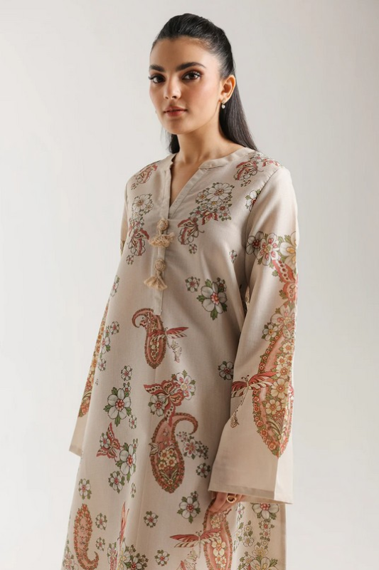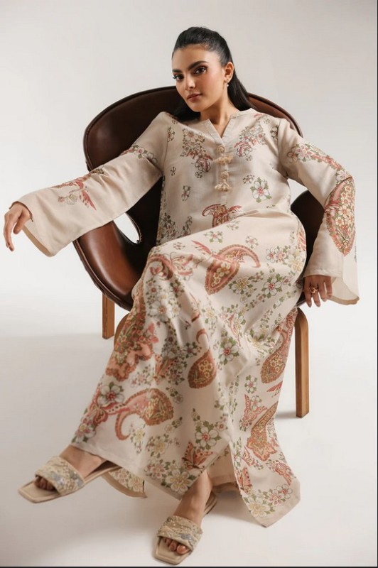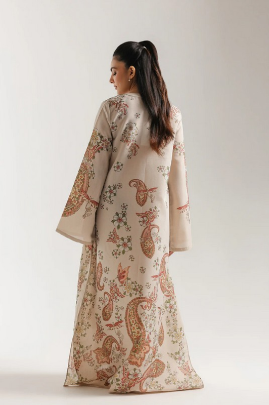 Radiate effortless charm in this ethereal printed dress, a masterpiece of fluid grace and artistic detail. Bathed in a serene ivory hue, the floor-length silhouette serves as a canvas for sprawling, vintage-inspired paisley and botanical motifs in soft terra-cotta and sage green. The delicate V-neckline is accented with elegant button detailing and playful tassels, while the voluminous wide sleeves add a touch of dramatic flair. Designed for both comfort and high-fashion impact, this dress is the ultimate statement piece for garden soirées or sophisticated summer escapes.