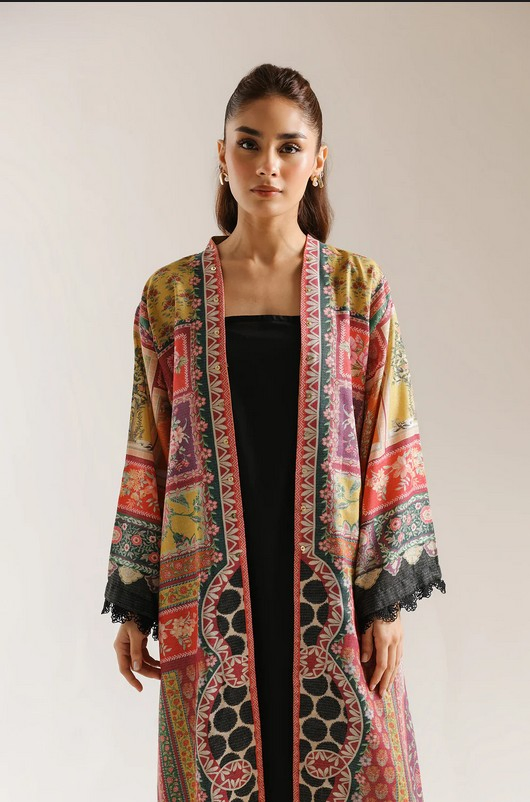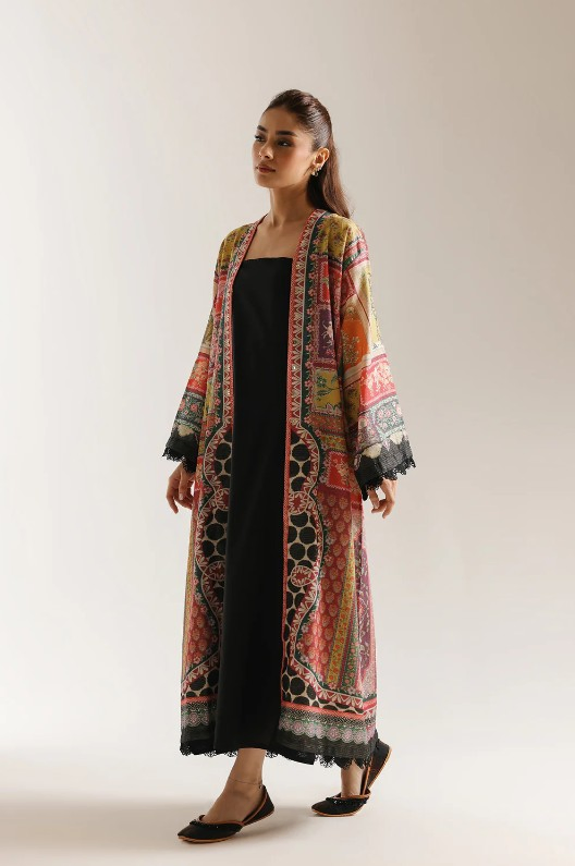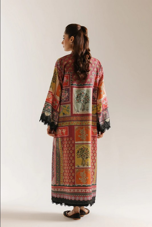 Elevate your wardrobe with this long-printed kimono, thoughtfully designed to make a refined statement. Rendered in a rich palette of earthy reds, muted greens, warm mustard, and soft neutrals, the piece features an intricate mix of ornamental and geometric-inspired prints arranged in vertical panels and detailed borders. The open-front silhouette flows effortlessly, enhanced by wide, relaxed sleeves finished with delicate black lace trims for a touch of texture and contrast. A coordinating lace finish along the hem adds understated elegance. Perfect for layering over minimal ensembles, this kimono blends artisanal charm with contemporary ease, making it a versatile addition to an elevated, modern wardrobe.