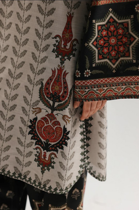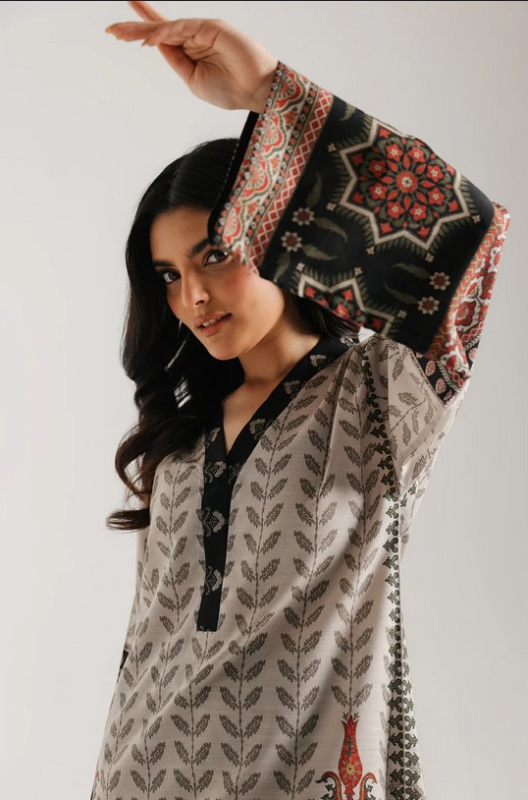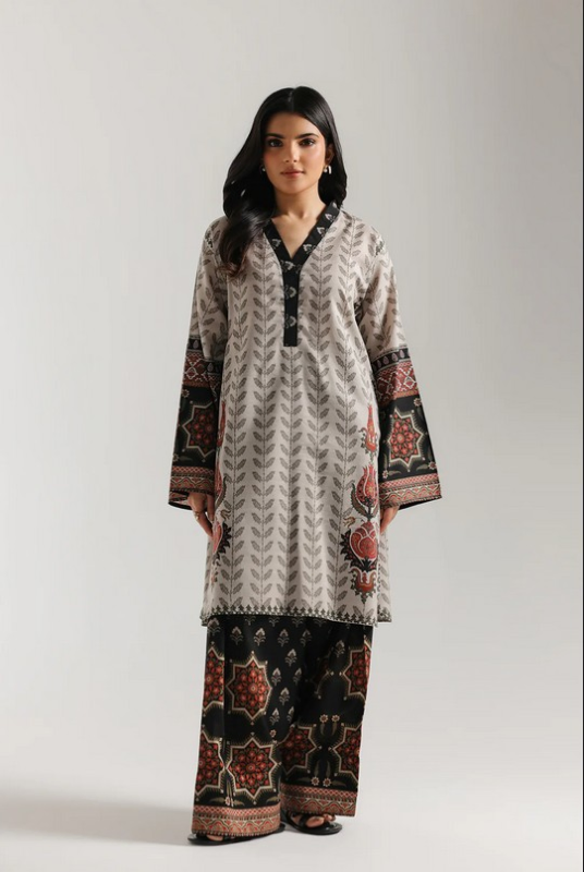 Step into a world of bohemian charm with this striking printed suit. Featuring a tunic adorned with rhythmic leaf patterns and bold geometric borders in burnt orange and black, it perfectly balances heritage and modern flair. Paired with ornate, wide-leg trouser, this ensemble is an effortless statement of artistic style.