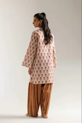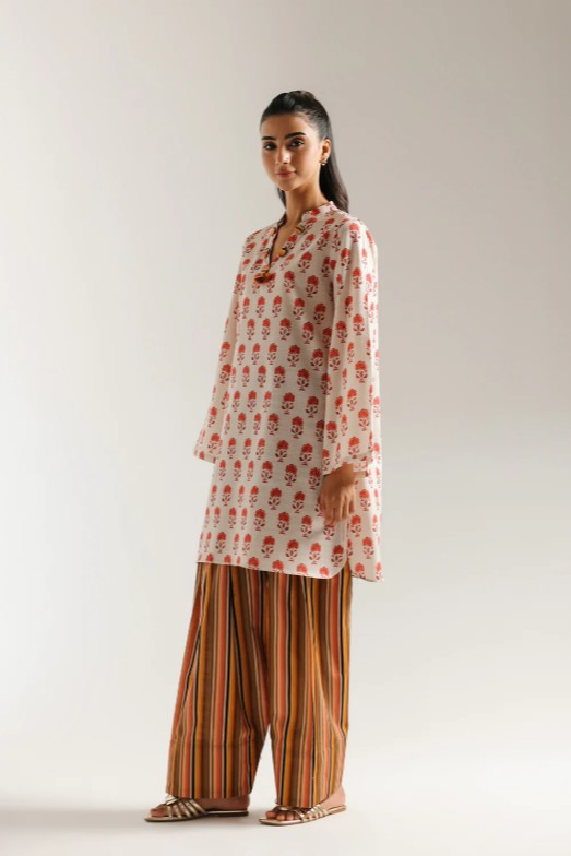 Infuse your wardrobe with vibrant flair with this striking printed suit. The shirt, in a crisp off-white, is patterned with bold, repeating floral motifs in a warm terracotta hue. A charming V-neckline with a delicate tassel detail adds a touch of bohemian grace. The ensemble is completed with straight shalwar that feature a playful, multi-colored stripe pattern in shades of orange, brown, and cream, creating a beautiful and dynamic contrast. This suit is the perfect choice for a day out where you want to make a bold, stylish statement.