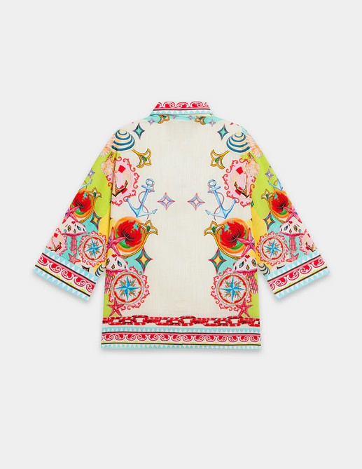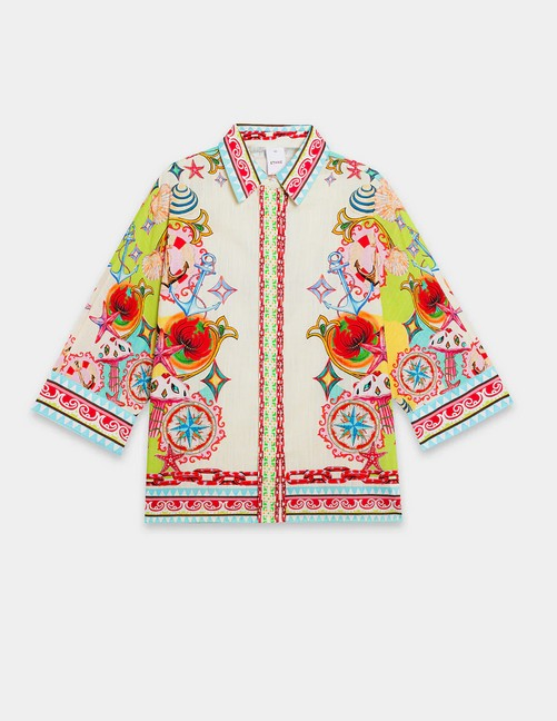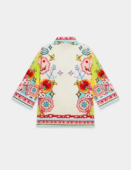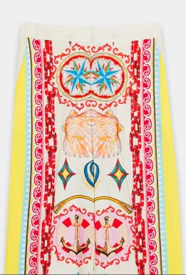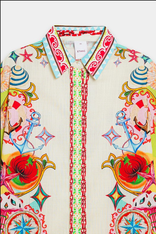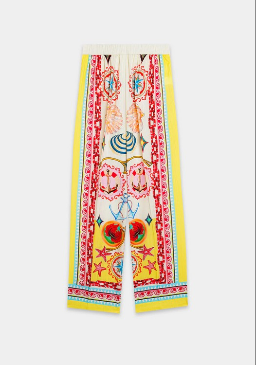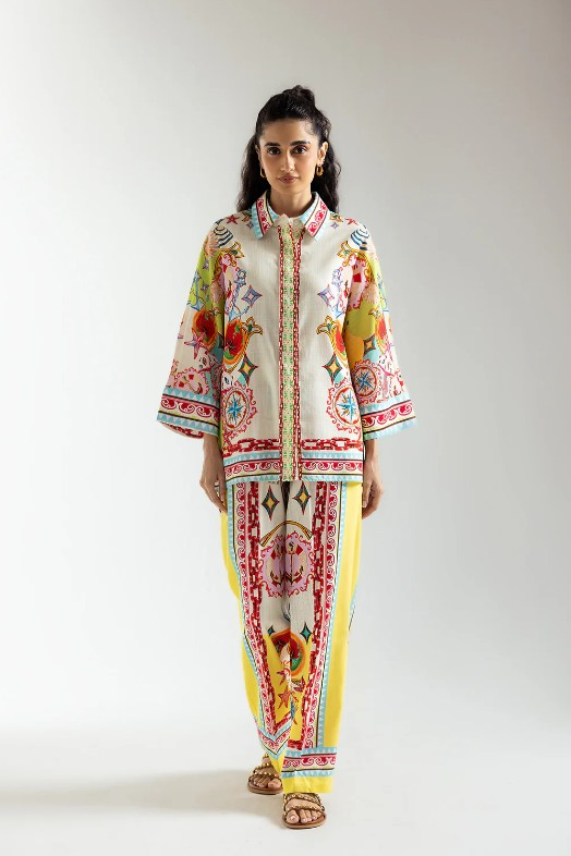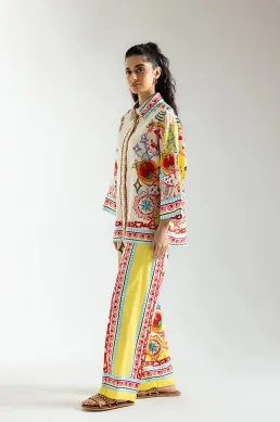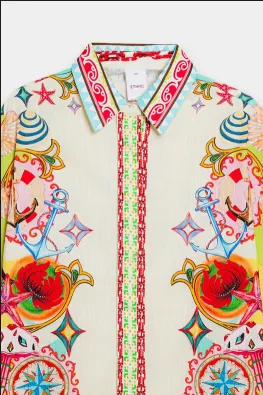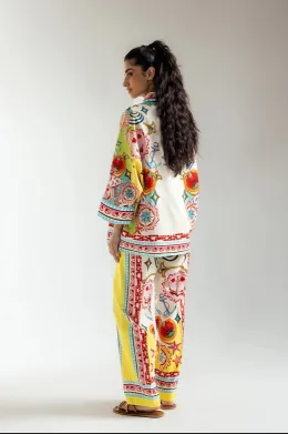 This stylish and modern outfit showcases a timeless, chic design in a classy aqua sky color. The elegant, button-down top is complemented by a captivating illustrations printed in vibrant colors on a flattering silhouette, while the matching trousers complete the ensemble. Perfect for any event during this fun season.