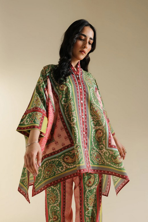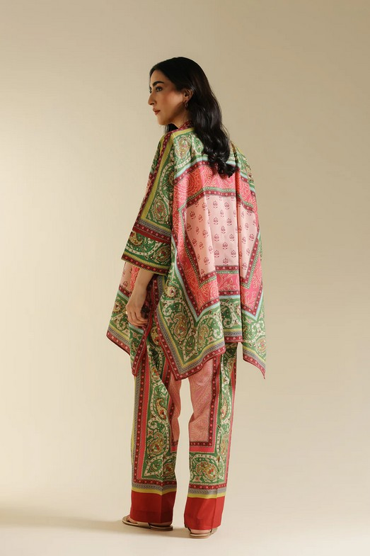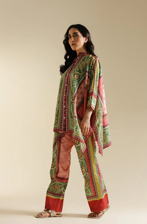 A contemporary composition is layered on this trendy button down kimono silhouette beautifully adorned with captivating artistic prints in vibrant colors portrayed on a luscious dull green canvas. Paired with a matching trouser, this style statement outfit is a perfect option for you to embrace this summer season.