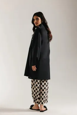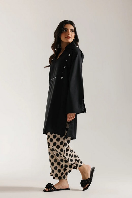 Make a bold and fashionable statement with this contemporary printed suit. This striking ensemble pairs a short-length kurti with wide-leg palazzo trouser. The kurti is crafted from a solid black fabric and features a modern V-neckline with a neat collar and a square of contrasting white button embellishments across the front. The drama lies in the trouser, which is made from a light-toned, beige fabric, featuring a large, abstract black dot print. This outfit offers a sophisticated high-contrast monochrome look with a chic blend of solid texture and bold pattern.