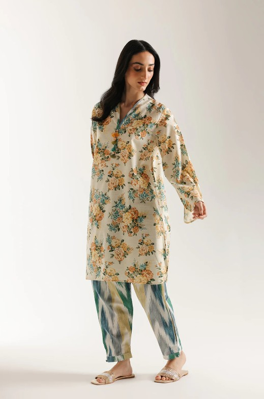 Dive into a vibrant mix of patterns with this captivating printed suit. The relax fit kurta is crafted from an off-white fabric and features a stunning all-over floral print in warm, sun-kissed shades of yellow, olive green, and peach. The kurta has a flattering V-neckline finished with subtle ties. The ensemble is completed with contrasting shalwar that boast a bold, artistic ikat print in shades of teal, yellow, and deep green, creating an effortlessly chic and unique look.