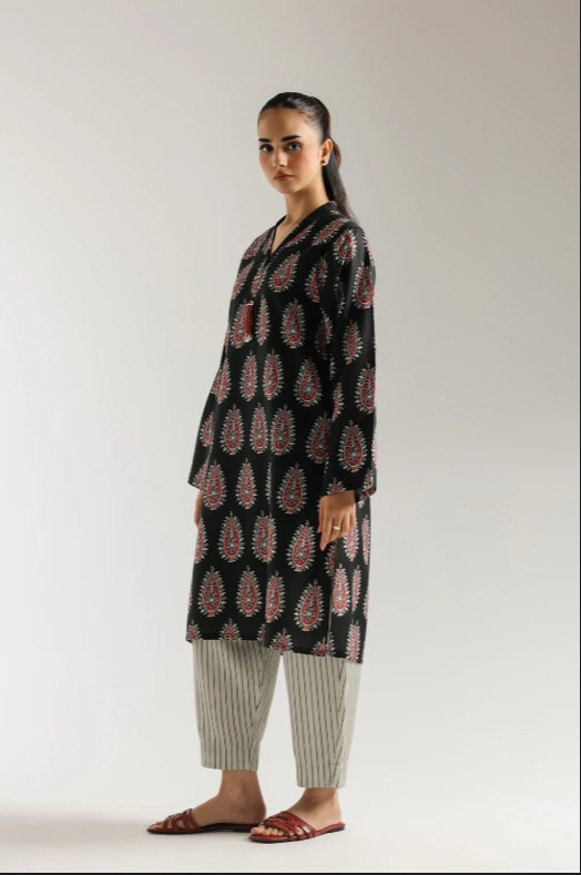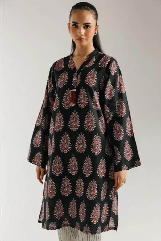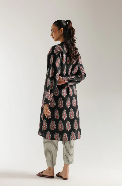 Step out in bold cultural style with this vibrant black printed ensemble, a striking fusion of traditional patterns and contemporary flair. The rich black tunic features a sharp V-neckline adorned with a single red tassel, setting a distinctive tone. The entire tunic is a canvas of intricate red and white paisley-like motifs, creating a mesmerizing all-over print that commands attention. Complementing this statement top are the comfortable straight trousers in an off-white or light grey, accented with subtle black vertical pinstripes, offering a chic contrast. This cohesive set is perfect for making a memorable impression at casual gatherings, festive events, or simply when you desire a look that is both stylish and undeniably unique.-Black Color-Stitched Article-2 pieceSize: Small(42), Medium(44)