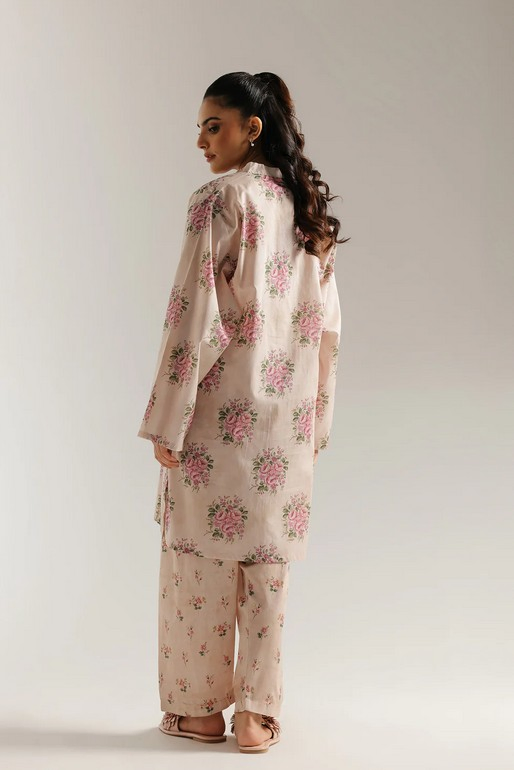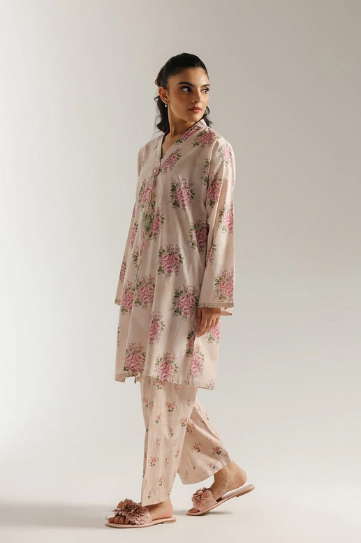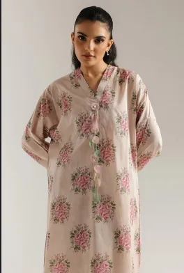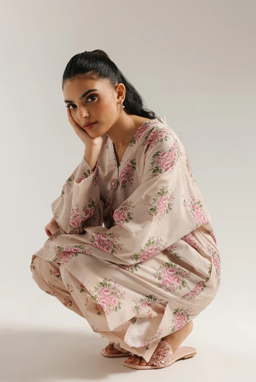 Wrapped in a cascade of blush and blooms, this printed suit is the epitome of romantic elegance. The soft, pink fabric is adorned with a delicate and timeless floral print in deeper shades of rose, creating a sense of serene beauty. The relaxed-fit shirt features a graceful V-neckline and full, voluminous sleeves, while the matching shalwar continue the charming floral pattern. This ensemble perfectly balances effortless comfort with refined, feminine style.