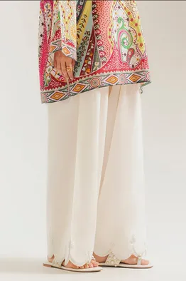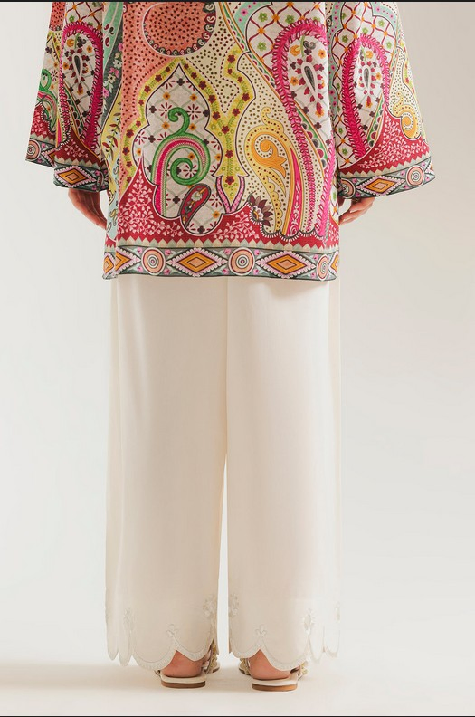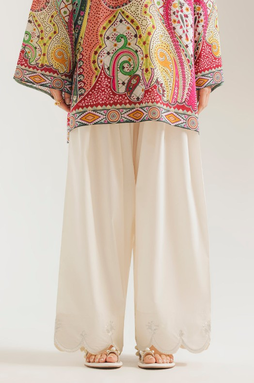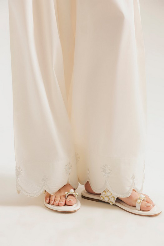 This elegant pair of voluminous shalwar is rendered in a clean off-white hue, offering a timeless and versatile foundation for vibrant ensembles. The design features a relaxed, wide-leg silhouette that flows gracefully, finished with a decorative scalloped hemline. Intricate tone-on-tone embroidery accents each scallop, adding a refined artisanal touch to the breathable fabric.