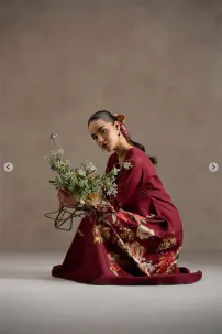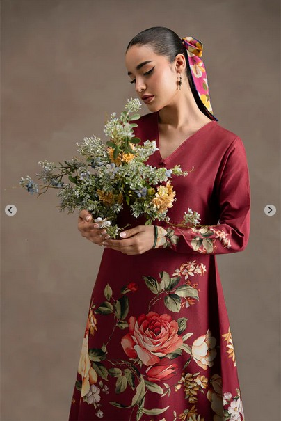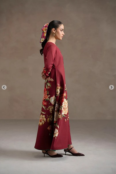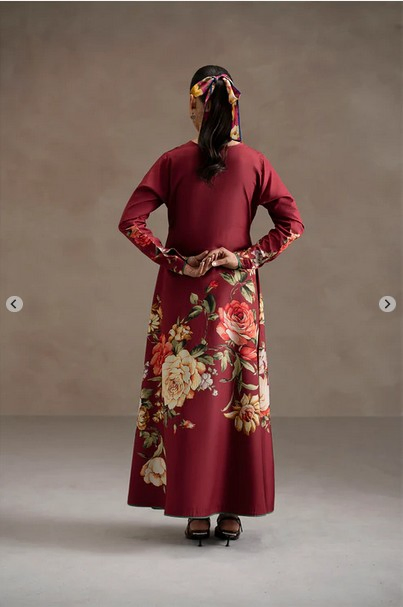 Embrace effortless elegance with this maroon printed poly lawn flared dress. Designed with a V-neckline and delicate loop buttons, it exudes timeless charm. The fitted printed sleeves add a touch of sophistication, making it a perfect blend of comfort and style.