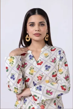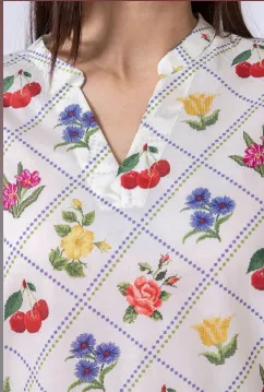 A short floral printed kurta featuring short sleeves and a band collar with a V-cut.