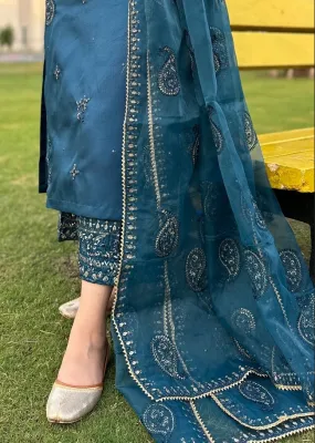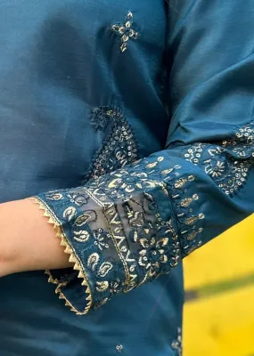 Radiate in the magic of timeless glamour with our festive ensemble, curated to reflect the unmatched style and charm of quality clothing. Outfit displays utterly quality silk in the shades of teal blue. Beautifully designed sequin embroidered shirt features intricate work at front of the shirt. Further enhanced with sequin embellished sleeves. Complemented by organza dupatta featuring heavy sequin and thread embroidery touched up with borders on all four sides. Paired with silk embroidered peplum style trouser having tilla and sequin borders at hem.