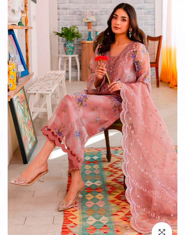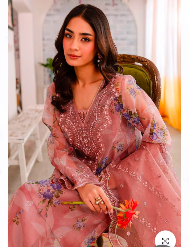 Printed And Embroidered Organza Shirt with Hand Embellishment On Neck Line Paired With Embroidered Organza Duppatta, Dyed Rawsilk Trouser And Inner