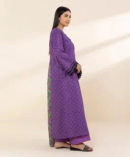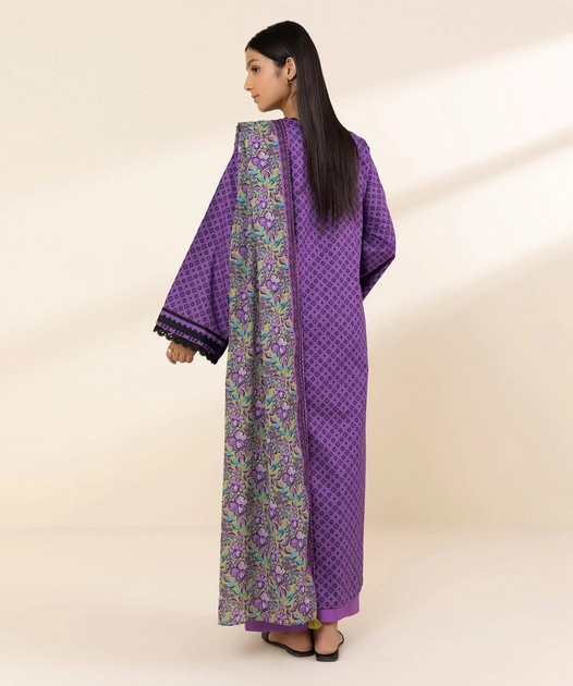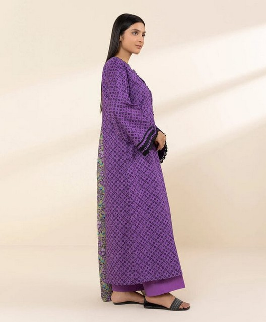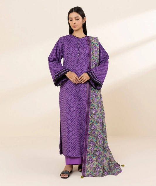 Make a statement with our three-piece printed purple and black ensemble featuring a lawn shirt paired with a voile dupatta and cotton trousers.