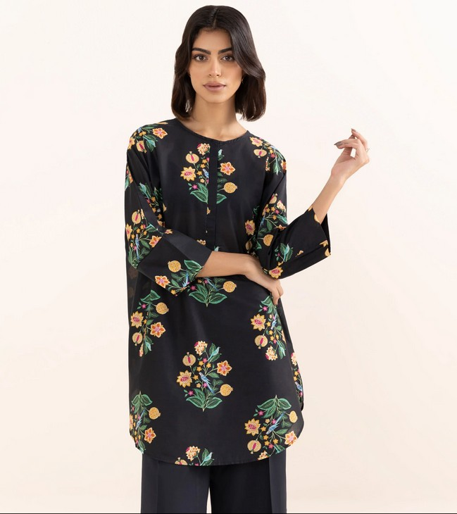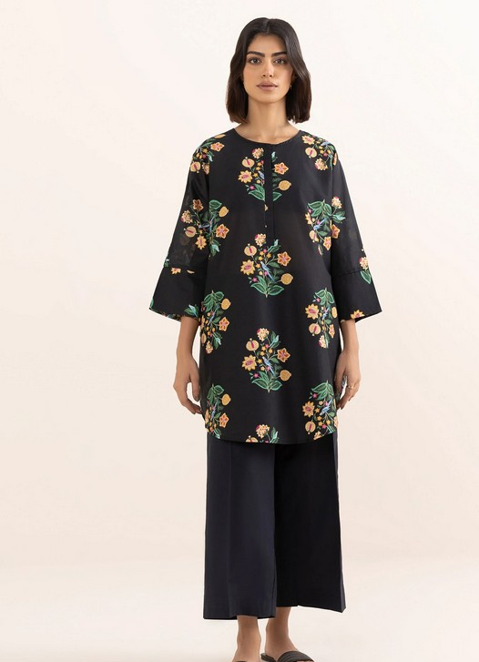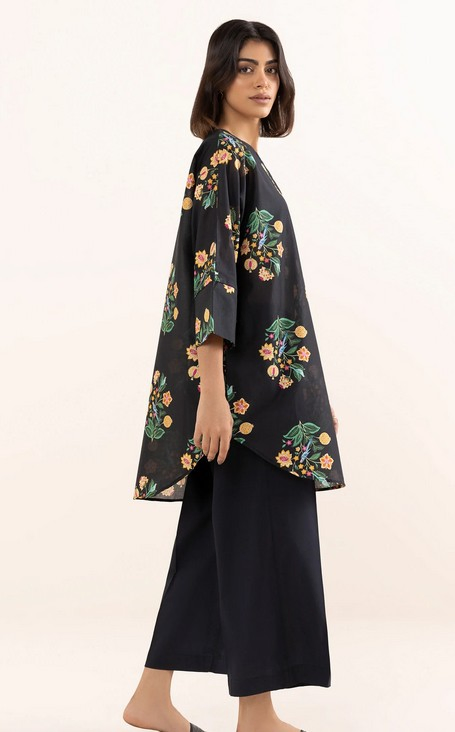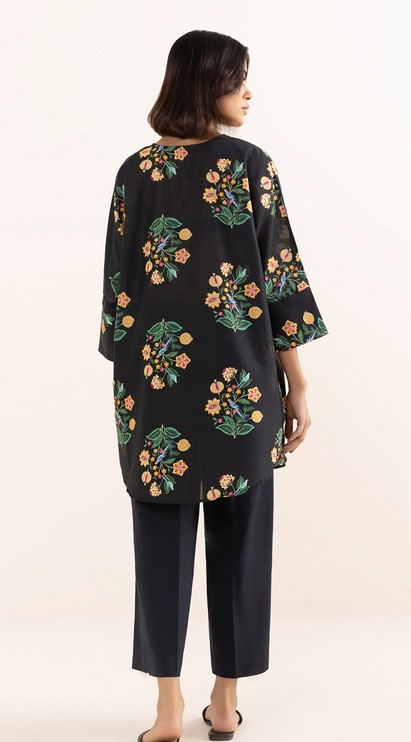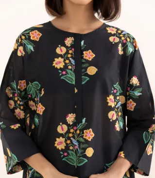 Upgrade your style in our printed black lawn drop shoulder shirt featuring a round neckline with placket.