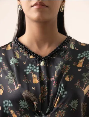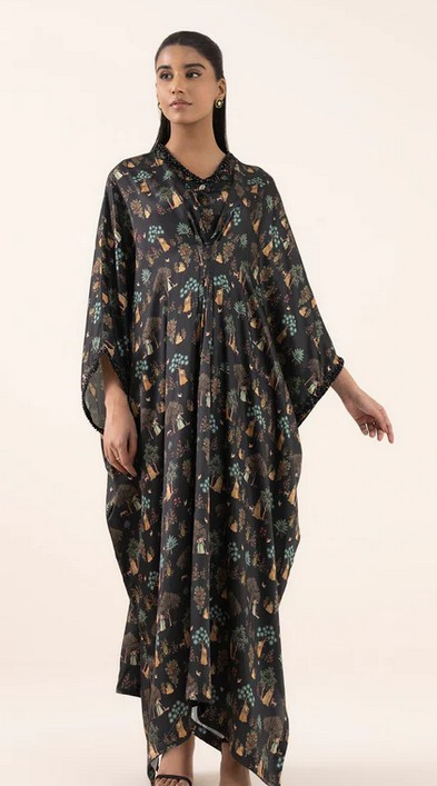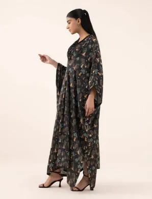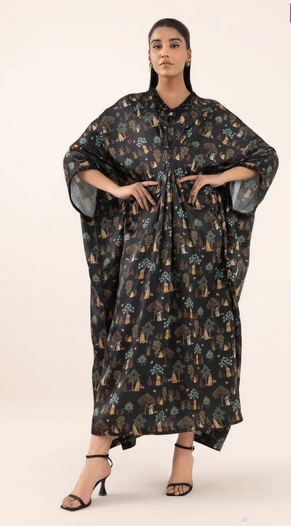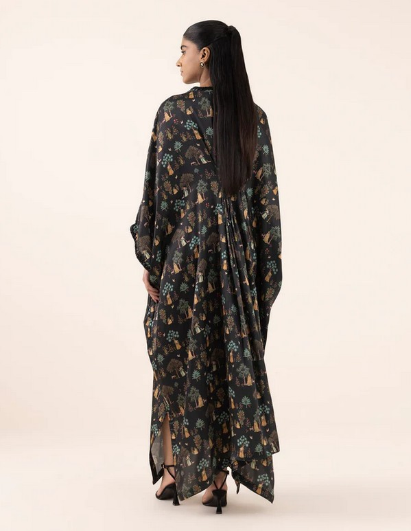 Details: Printed Front Panel, Printed Back Panel, V Neckline, Full Sleeves, Long LengthColour: BlackFabric: Blended Satin