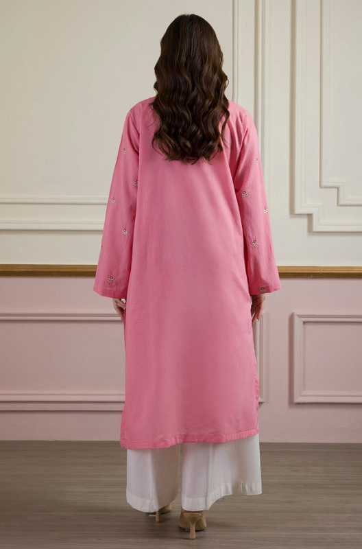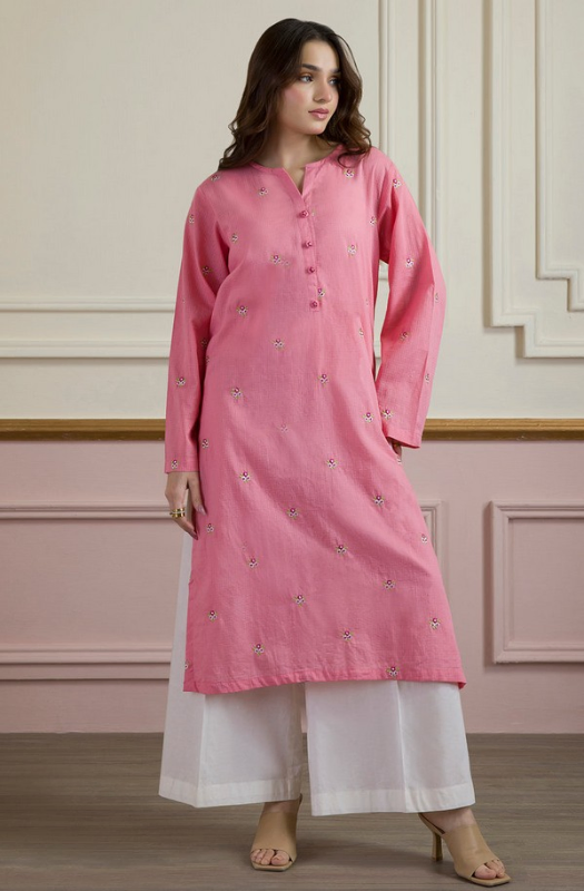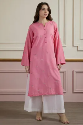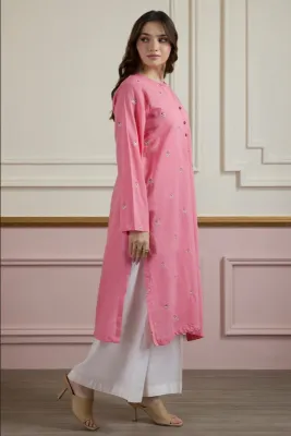 This embroidered pink kurta, crafted from lightweight lawn fabric, offers a perfect blend of comfort and elegance for women. Designed as a pret wear, it ensures ease of styling for everyday or festive occasions, combining traditional craftsmanship with modern appeal. Ideal for those seeking breathable fabric with intricate detailing.